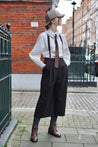 Channeling the unmistakable charm of classic detective style, the Holmesian Winter Barrel Culottes blend vintage flair with modern sophistication. Their distinctive barrel silhouette - structured yet easy through the leg - echoes the tailored practicality of Victorian menswear while offering contemporary comfort. Cut from a beautifully thick winter-weight fabric, they hold their shape effortlessly while keeping you warm through the colder months. Designed to pair with the included brown adjustable braces, these culottes nod directly to the iconic Sherlock Holmes aesthetic. Whether worn with a crisp shirt or layered under a chunky knit, they bring mystery, elegance, and a touch of literary nostalgia to every outfit.