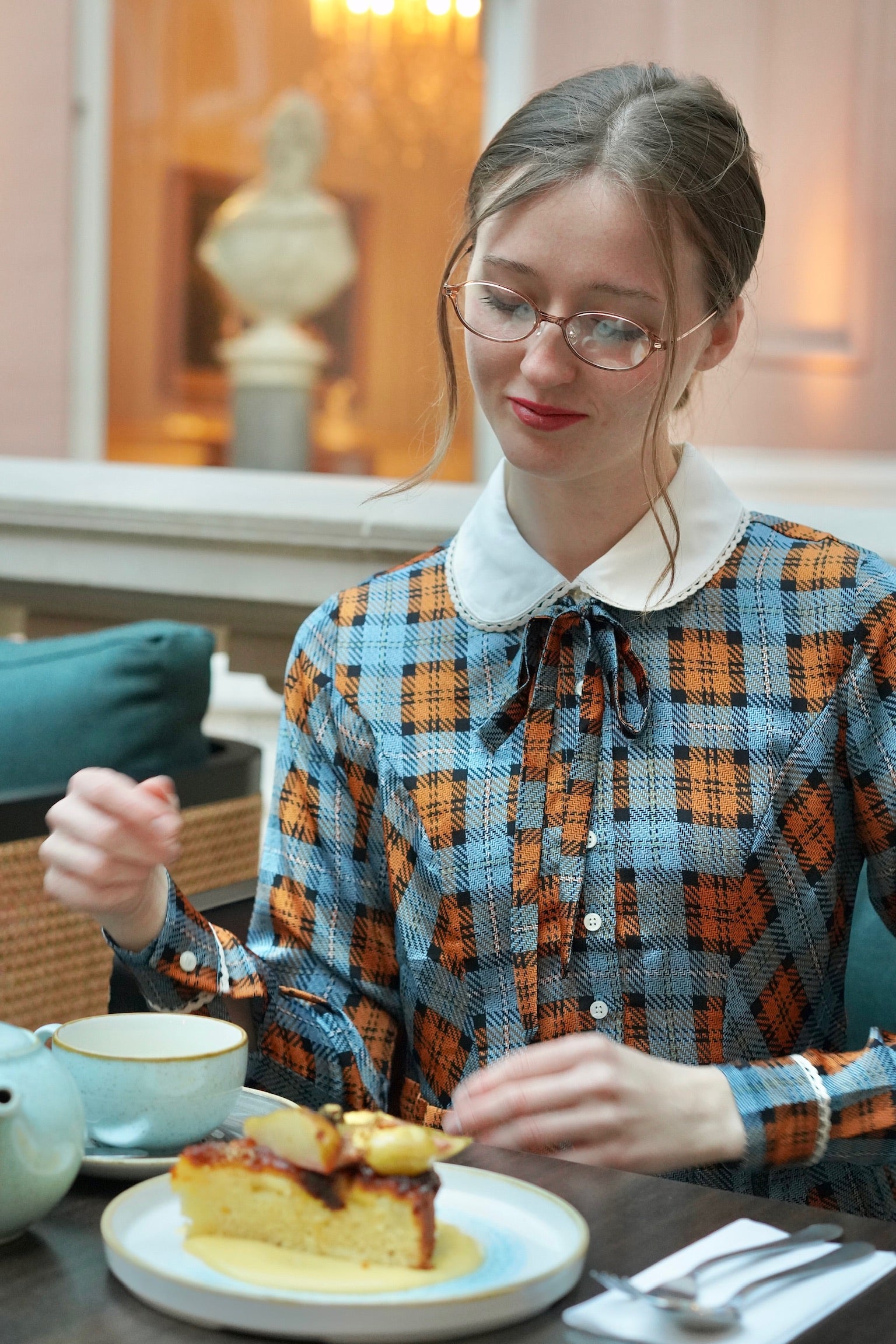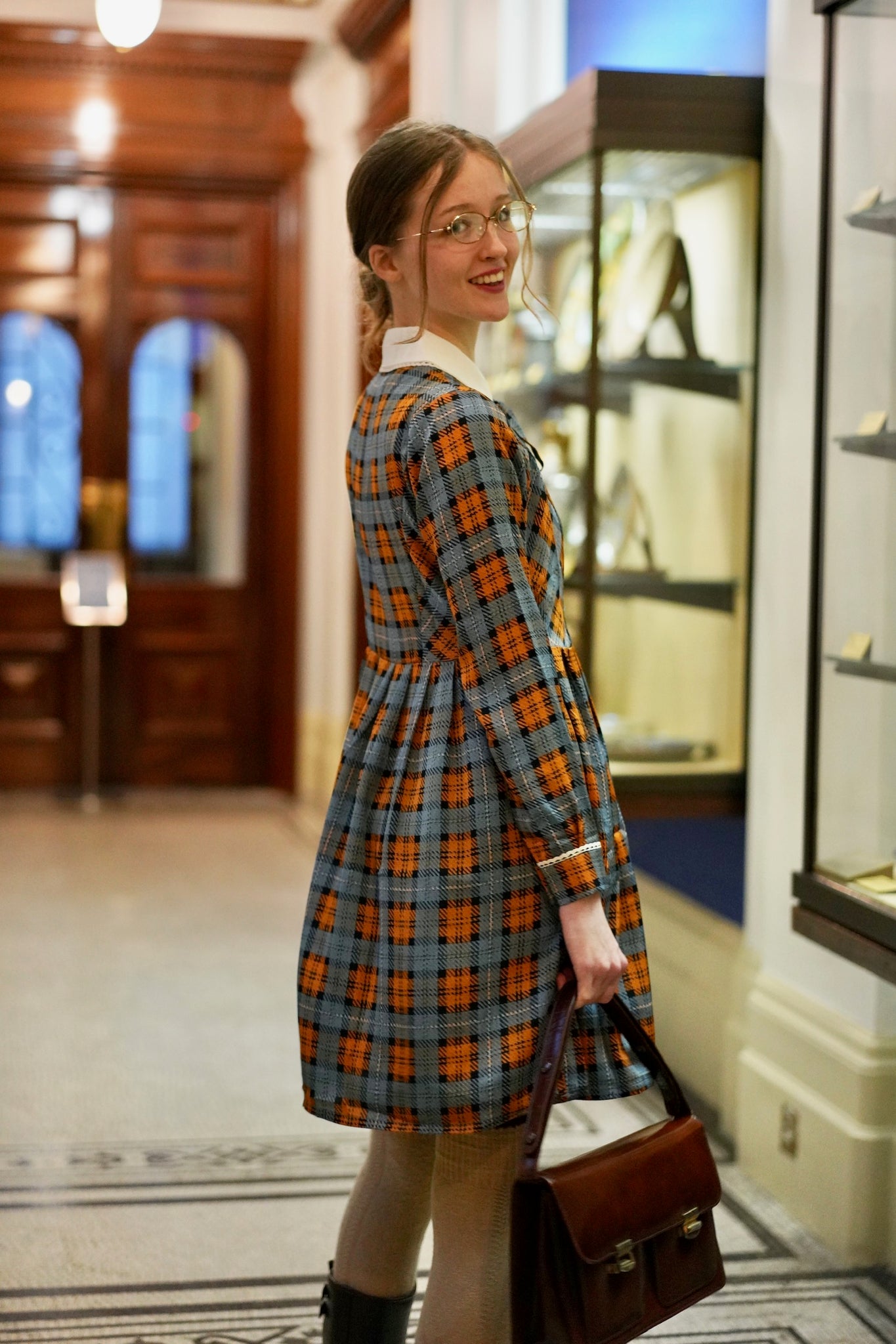 In lively orange and blue, this plaid dress is made for strolling around campus, or for bringing the preppy look to the city. With a quintessentially Scottish tartan print, this Peter Pan collar dress is inspired by the 60's fashion. A must-have retro statement piece!