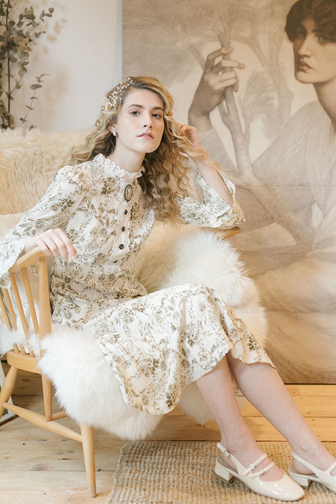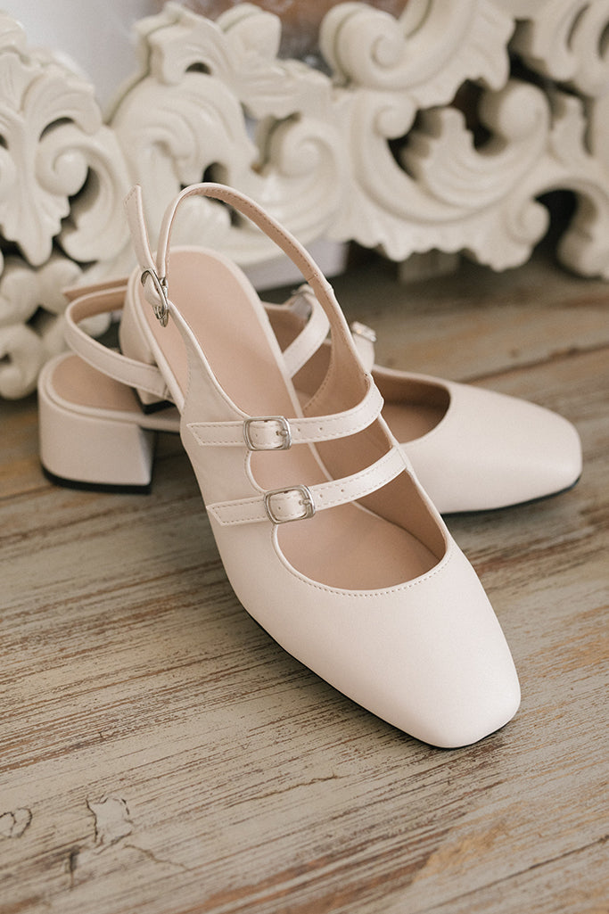 • White faux leather Mary Jane pumps show the 1960s style for a vintage look