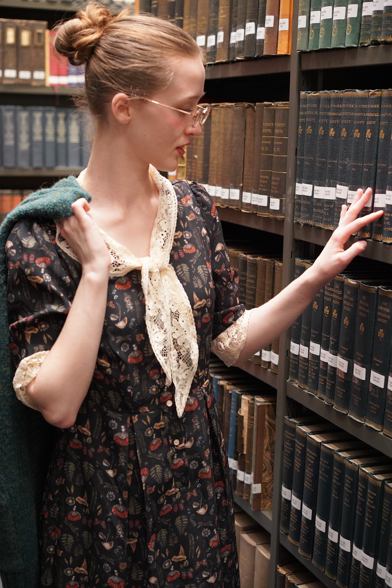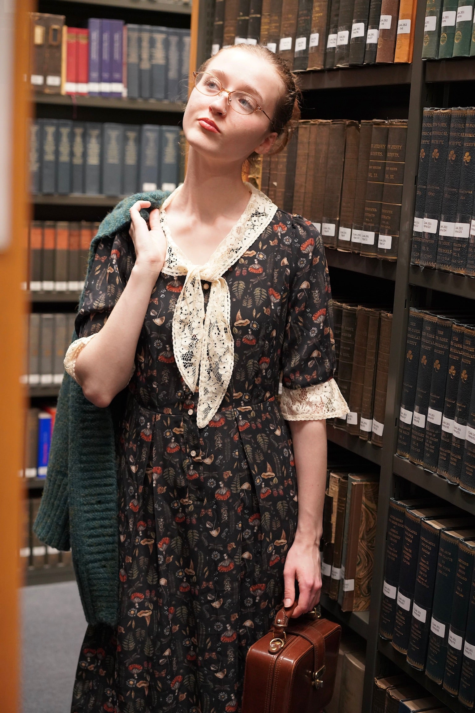 Enter a world of forgotten libraries, woodland discoveries, and a quiet adventure with the Forestry Dress. Inspired by vintage research rooms and the magic of the forest floor, this mid-length silhouette feels like something a curious botanist or relic-seeker might wear while uncovering hidden truths among the shelves.