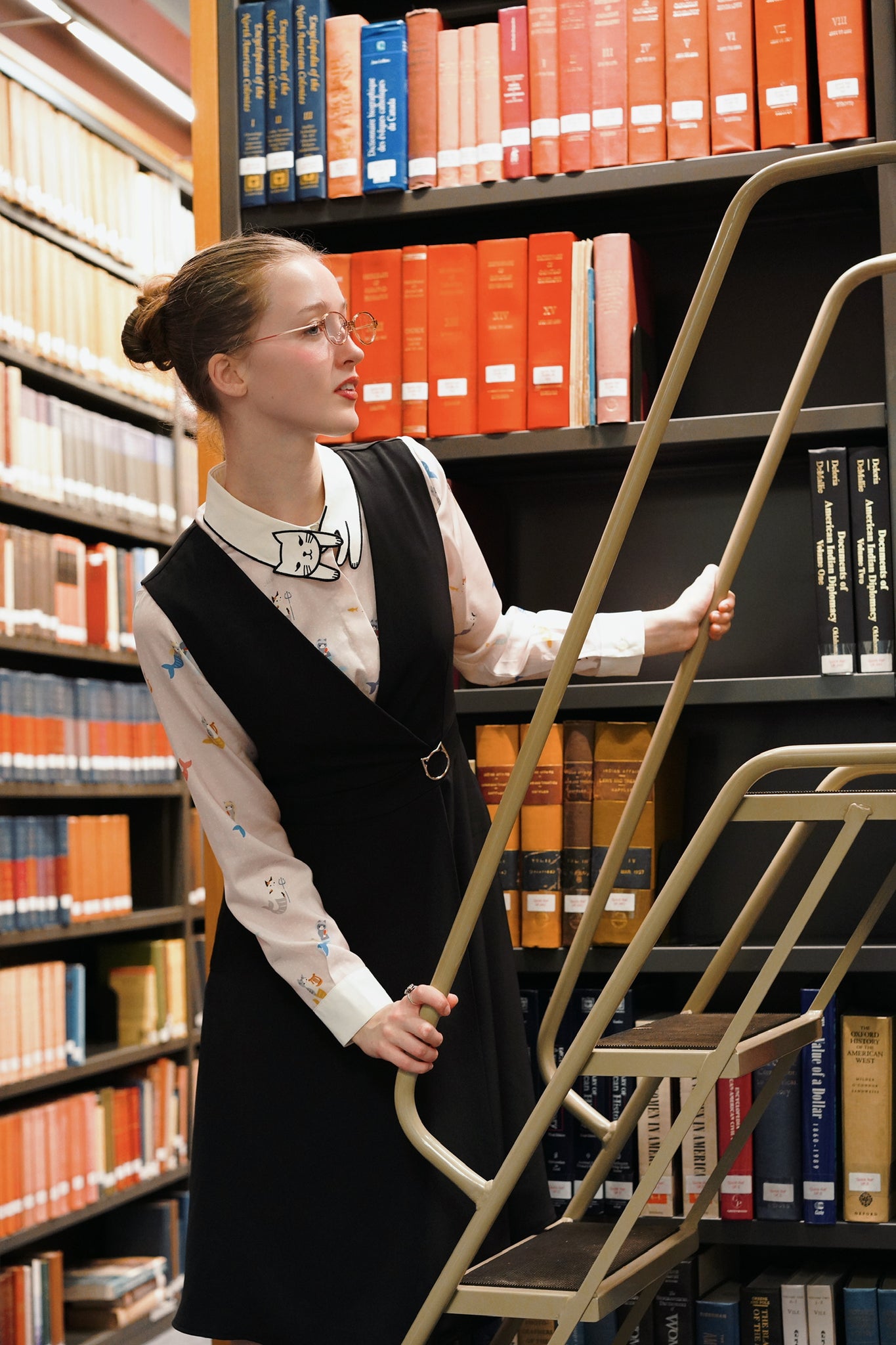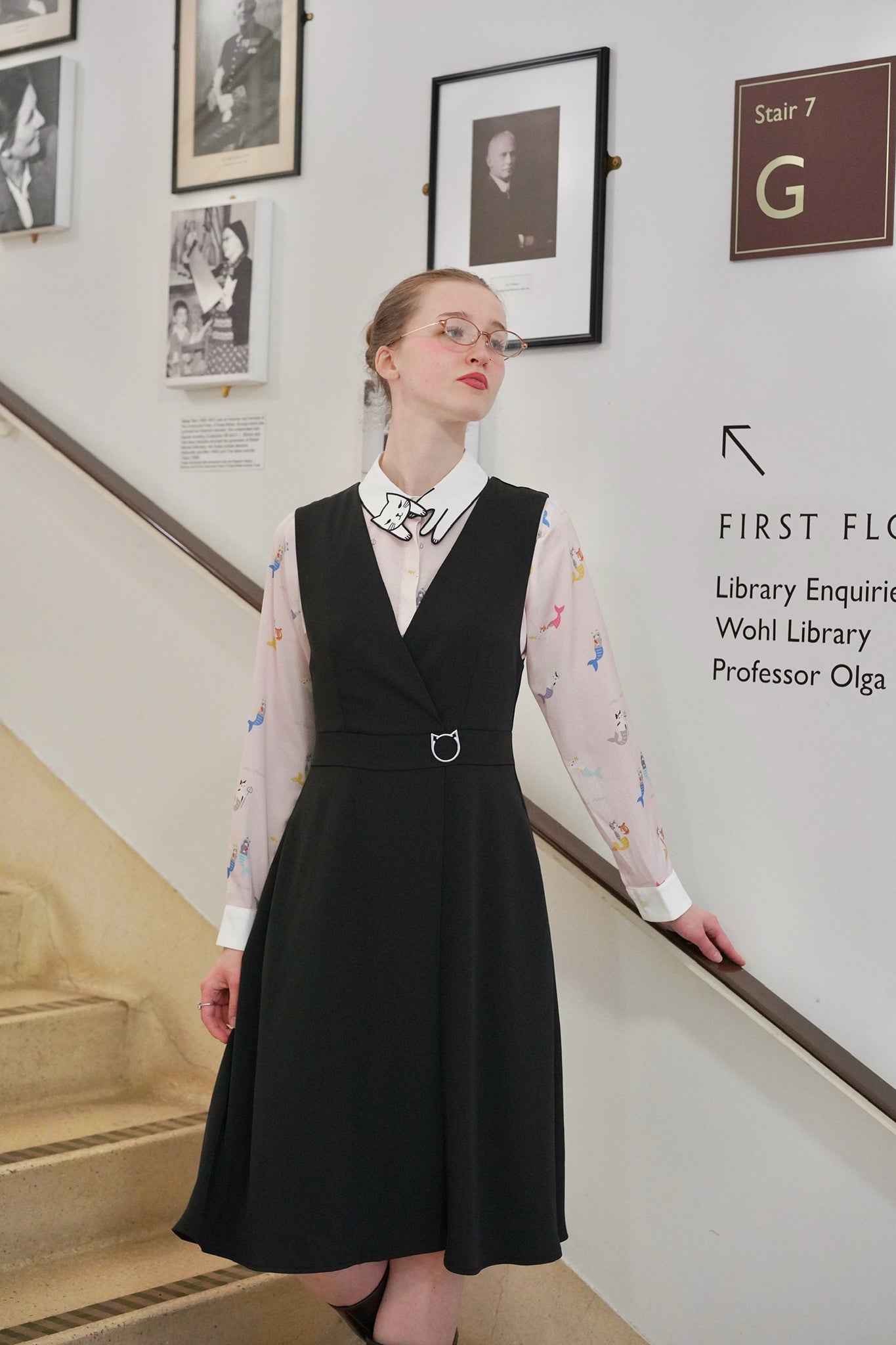 Crafted from a drapey, crease-resistant fabric, it falls clean and smooth throughout the day. The waist is finished with a delicate silver kitty buckle, adding a quiet touch of Miss Patina cat lady personality.