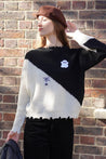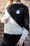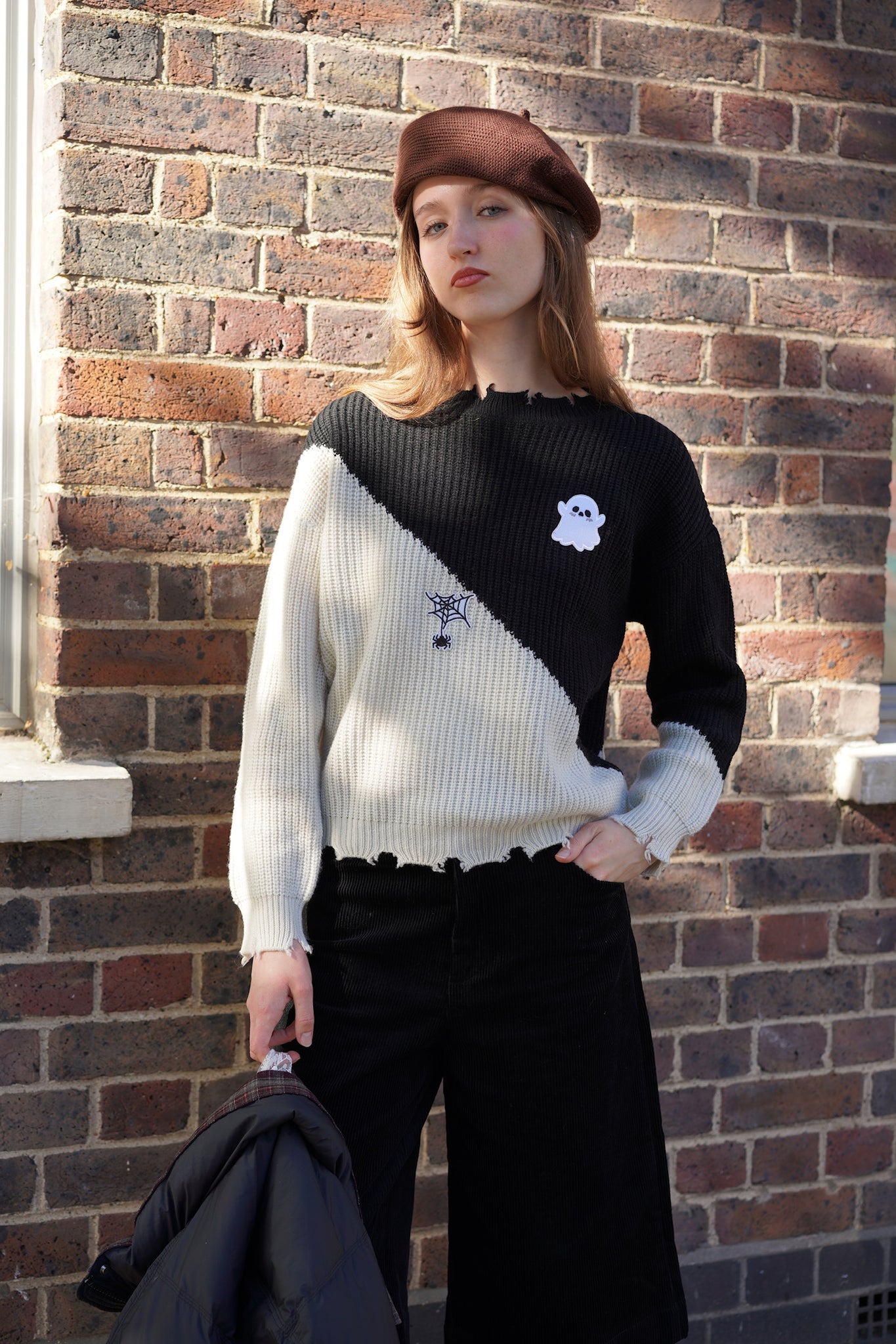 A cosy knit with a playful spooky twist. This limited-edition Halloween sweater features a bold black-and-white color block design, accented with a mischievous little ghost and a spider-web embroidery detail. Distressed edges add a vintage, lived-in charm, making it the perfect balance of cute and eerie.