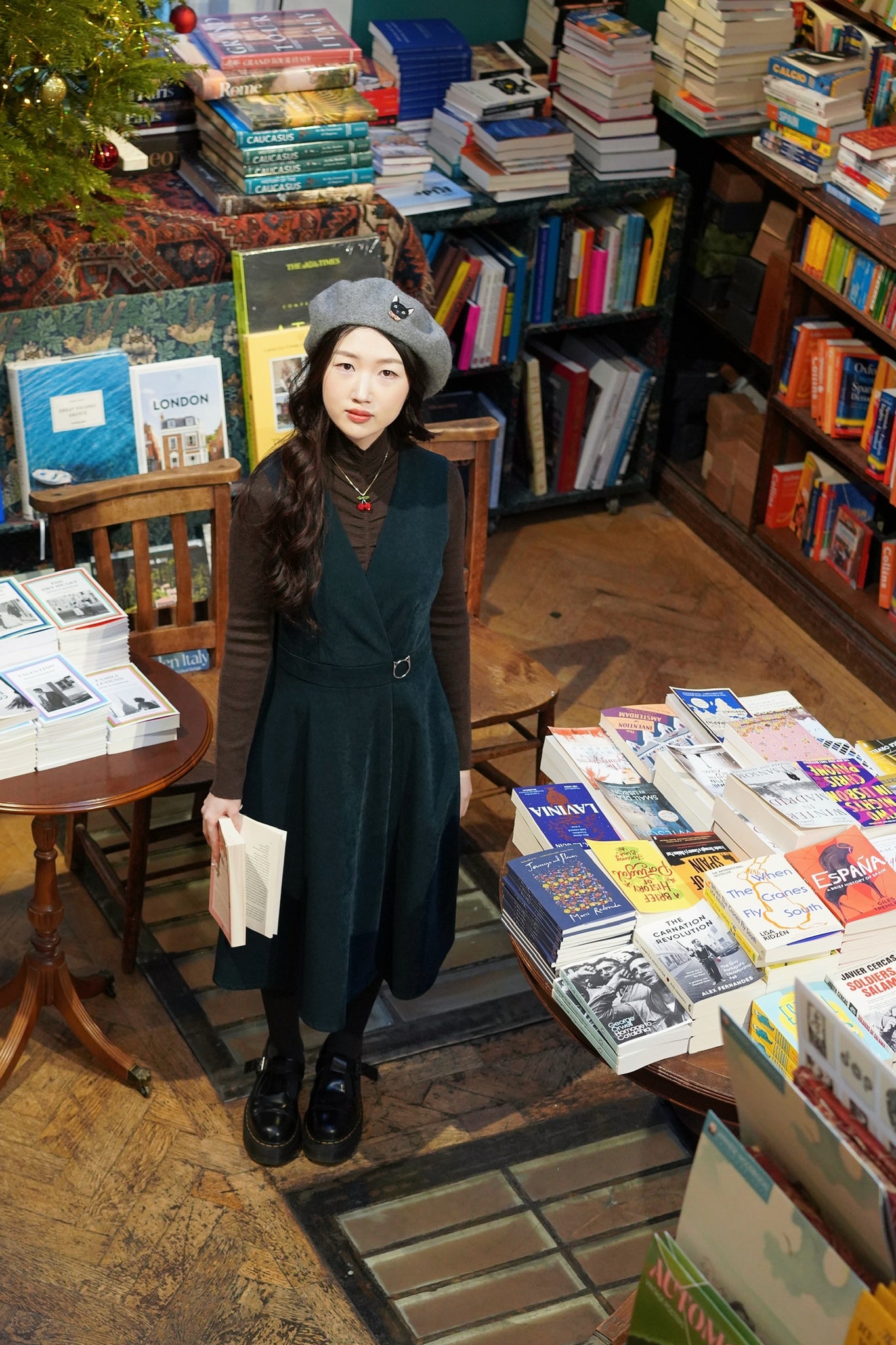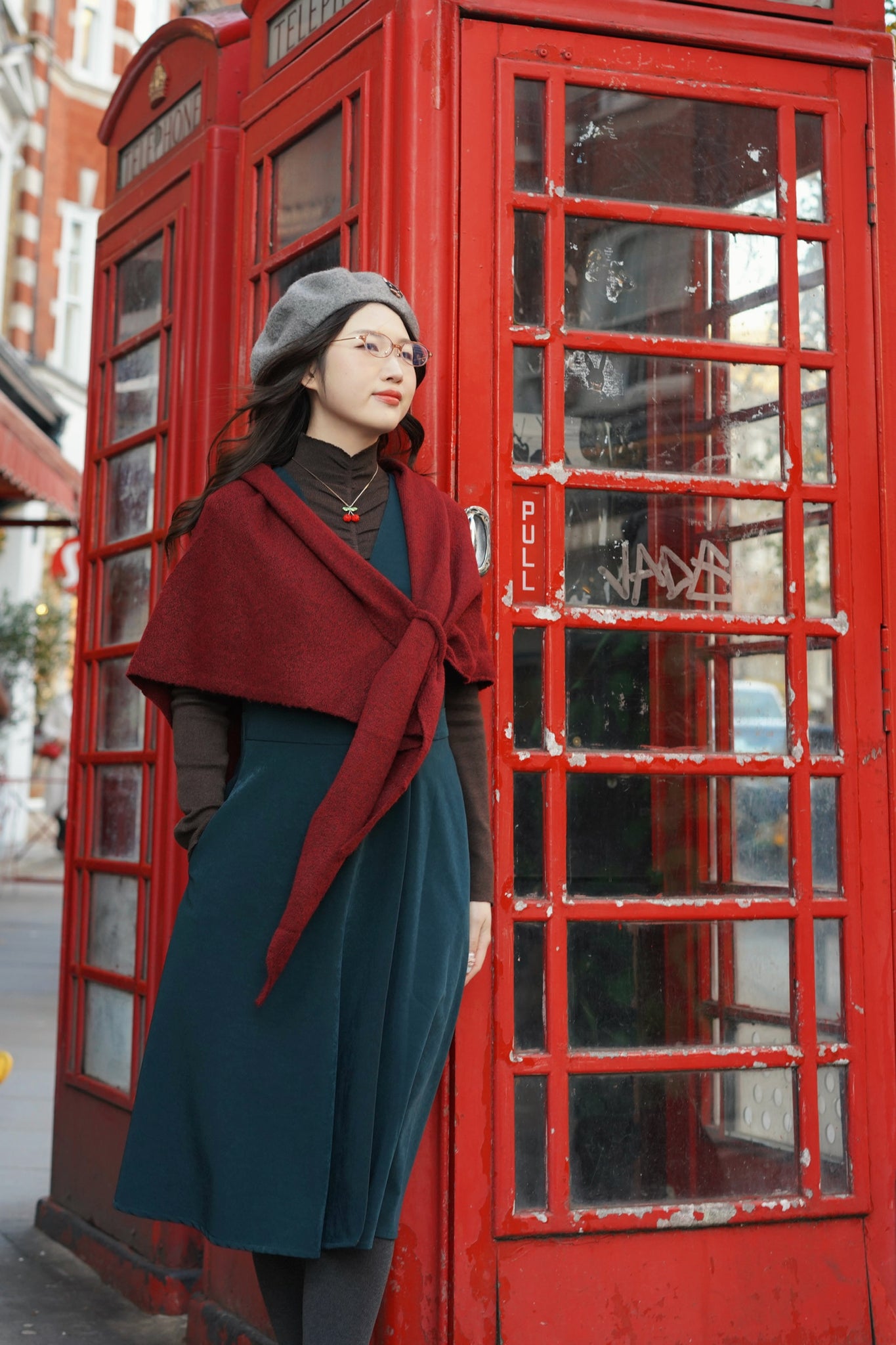 Crafted from a crease-resistant fabric with a soft, velvety feel, it falls clean and smooth throughout the day. The waist is finished with a delicate silver kitty buckle, adding a quietly playful touch of Miss Patina’s preppy cat-lady charm.