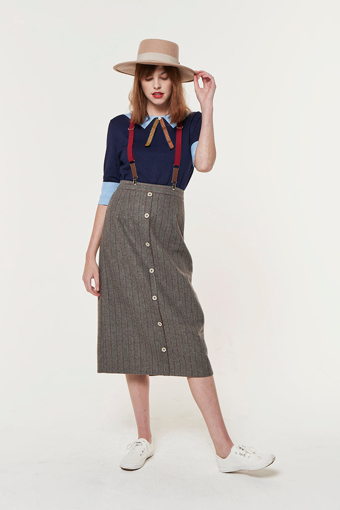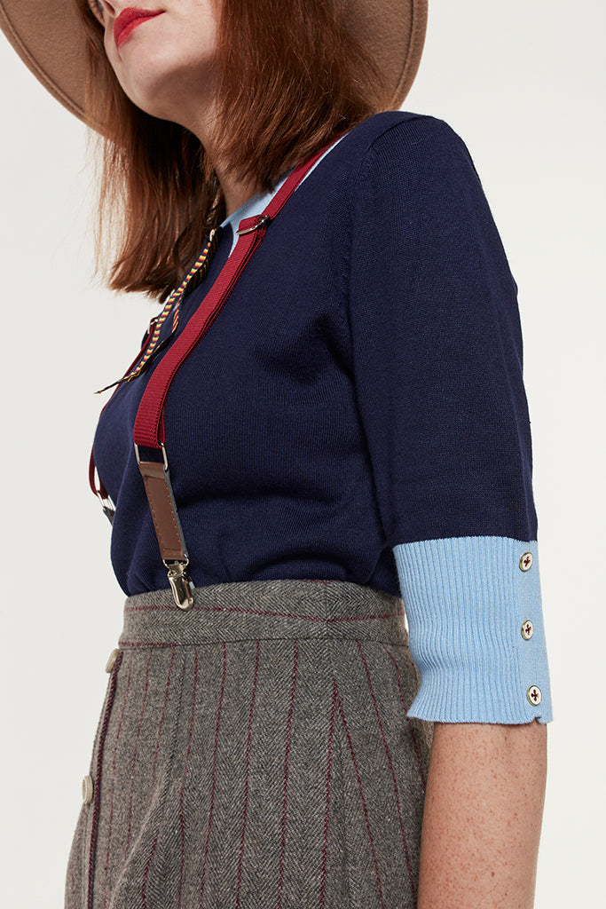 This top reflects the mood of a British school uniform and is bound to make you reminisce on those glorious school days when life was simpler. Crafted from a soft fabric, featuring a standout mock collar and sleeve cuffs. To finish off the look it is topped with an orange tie in the middle!
