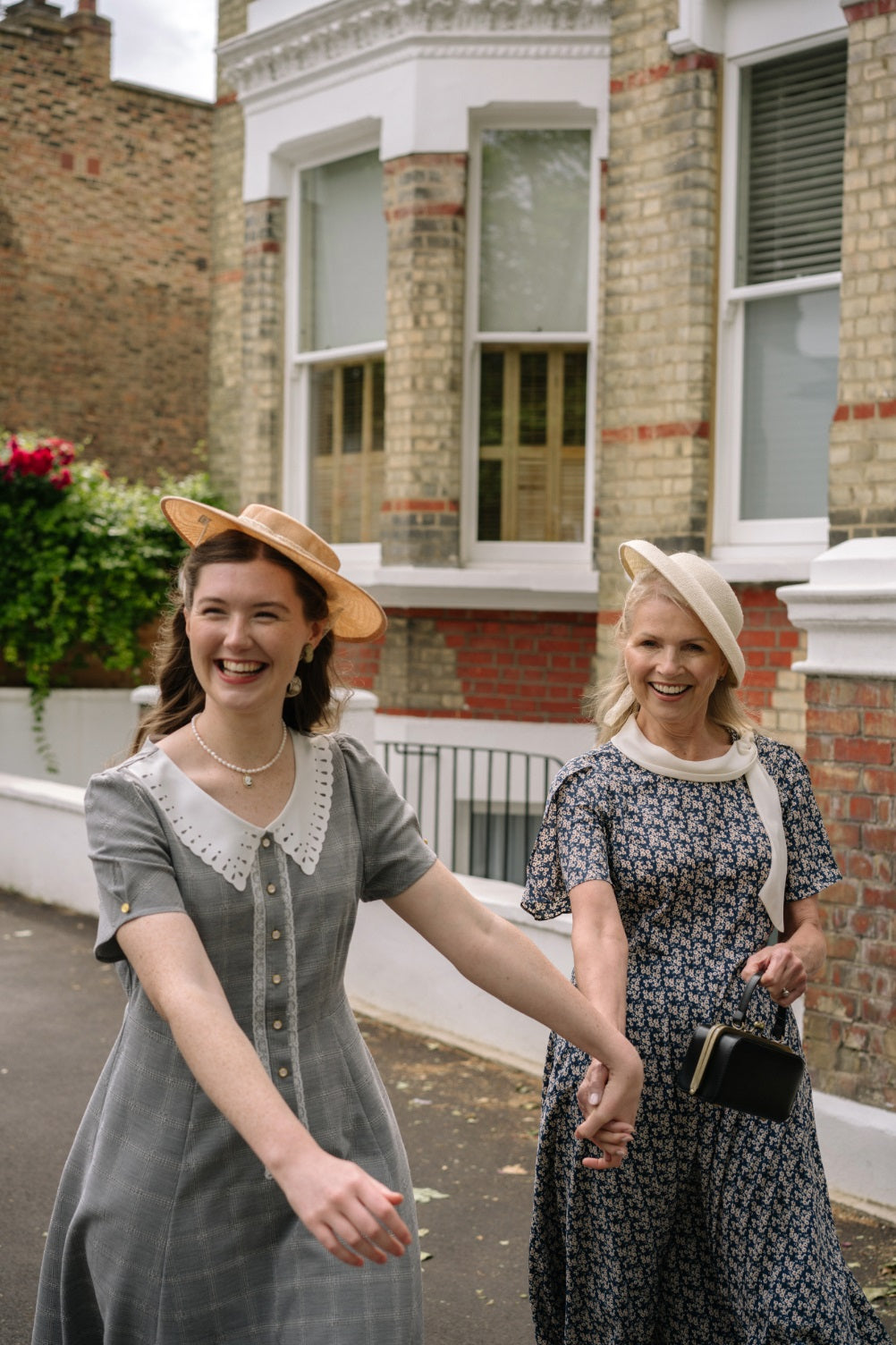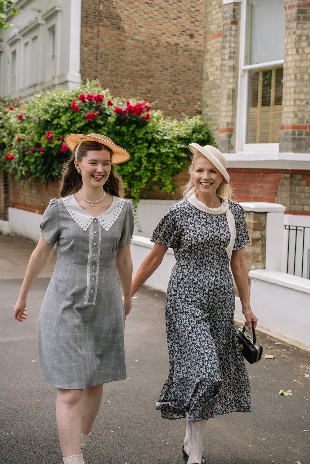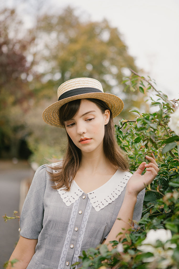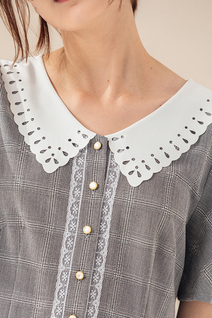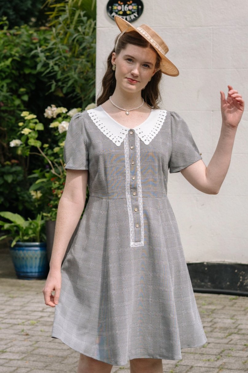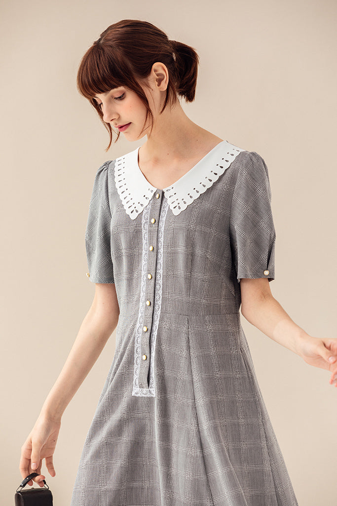 Introducing this 1950's inspired plaid print short sleeve A-line dress. Crafted from a medium weight fabric with a flattering collar and laser-cut scalloped edge. Finished off with a button-down front and a vintage lace trimming. Perfect for fancy occasions and everyday moments, pair with a shoe of your choice and pearls to match that 50's feminine style!