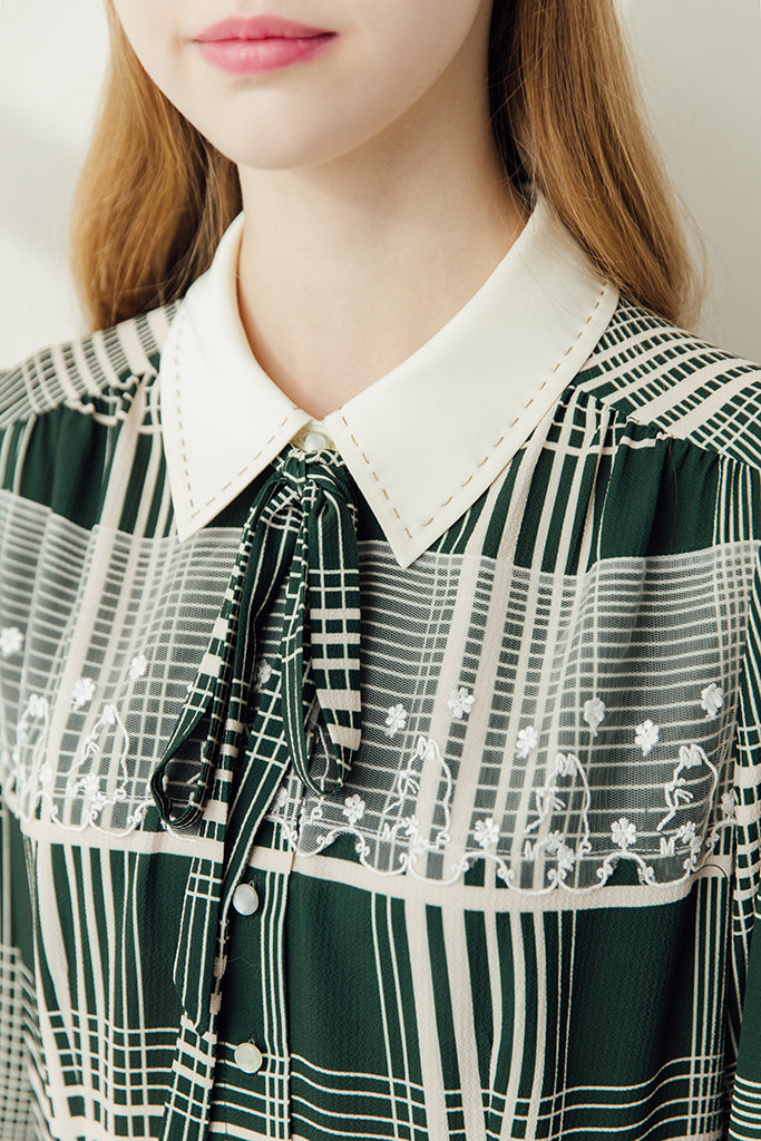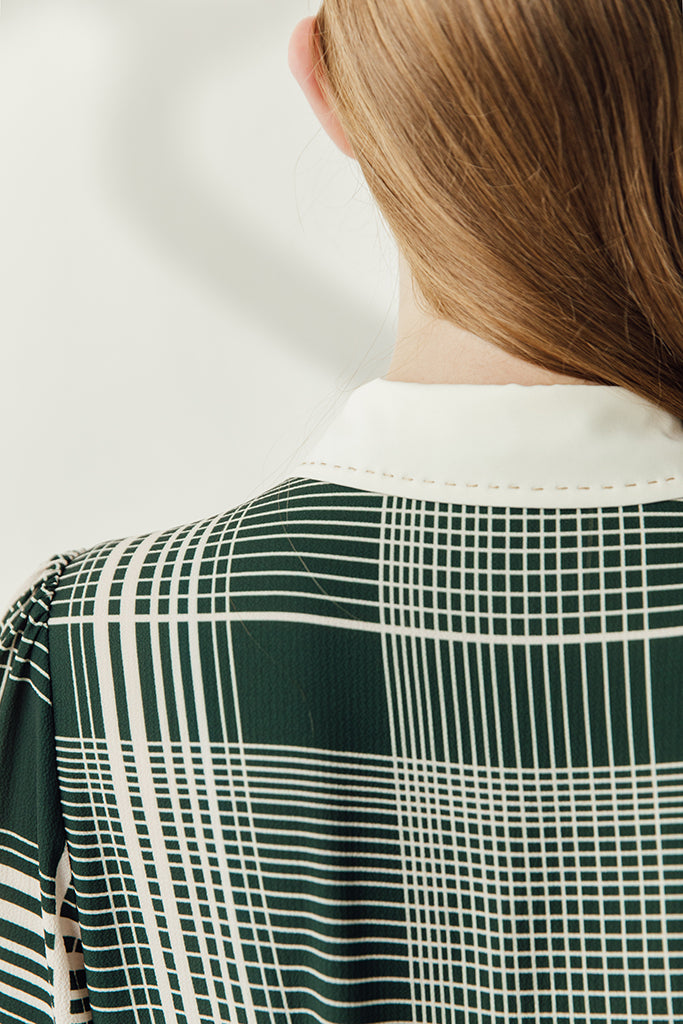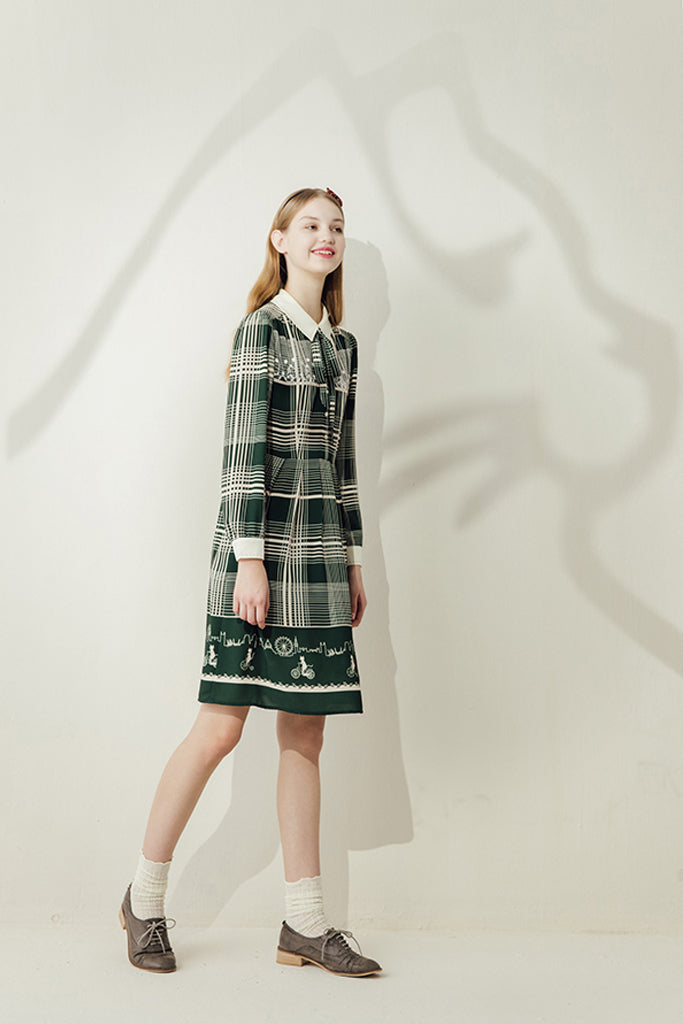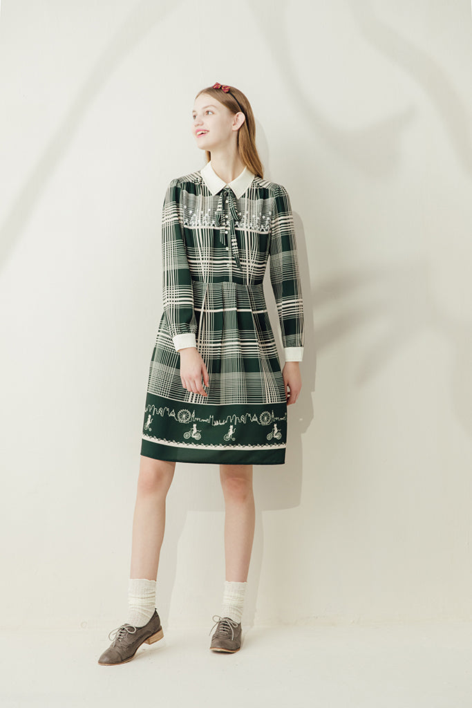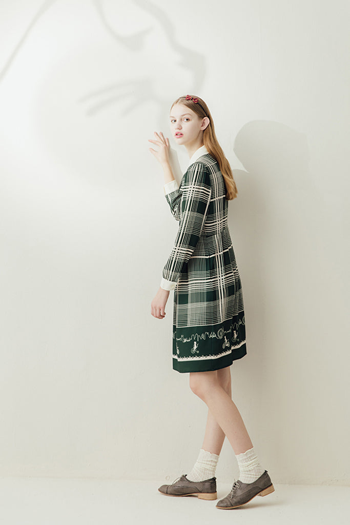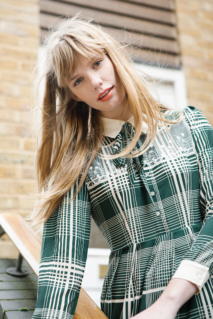 A busy 1940s inspired cream and hunter green check mimics the hustle and bustle of busy London and ties in perfectly with Miss Patina’s 2018 London Ride Kitten collection. Cream cuffs and a stitched cream collar frame exquisite white lace embroidered with inquisitive kittens. The hem displays cats going about their working day as they whizz through the city on bikes and scooters. A truly magical piece.
