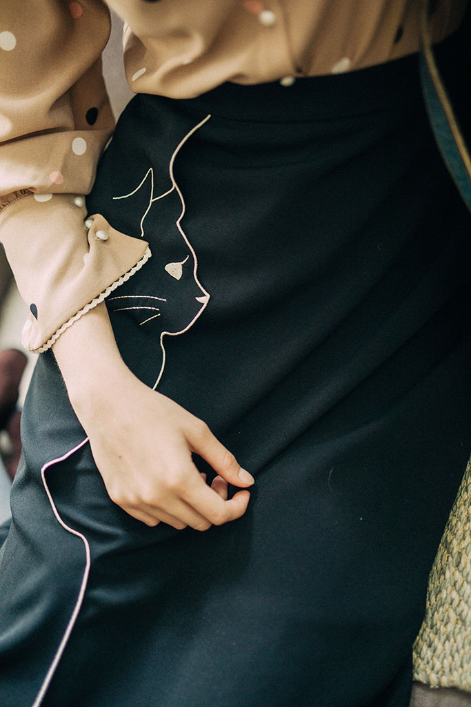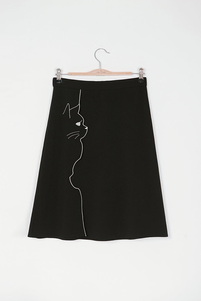Introducing this charming a-line skirt, a delightful blend of playful design and subtle sophistication. This knee-length skirt features an adorable embroidered kitten design and a hidden Holmes waistband. Designed with convenience in mind, the skirt is equipped with a discreet zip on the back, ensuring easy wear and removal. Please note that this skirt tends to run small, so we recommend sizing up for the perfect fit. To find your ideal size, refer to our detailed measurements for accurate guidance!