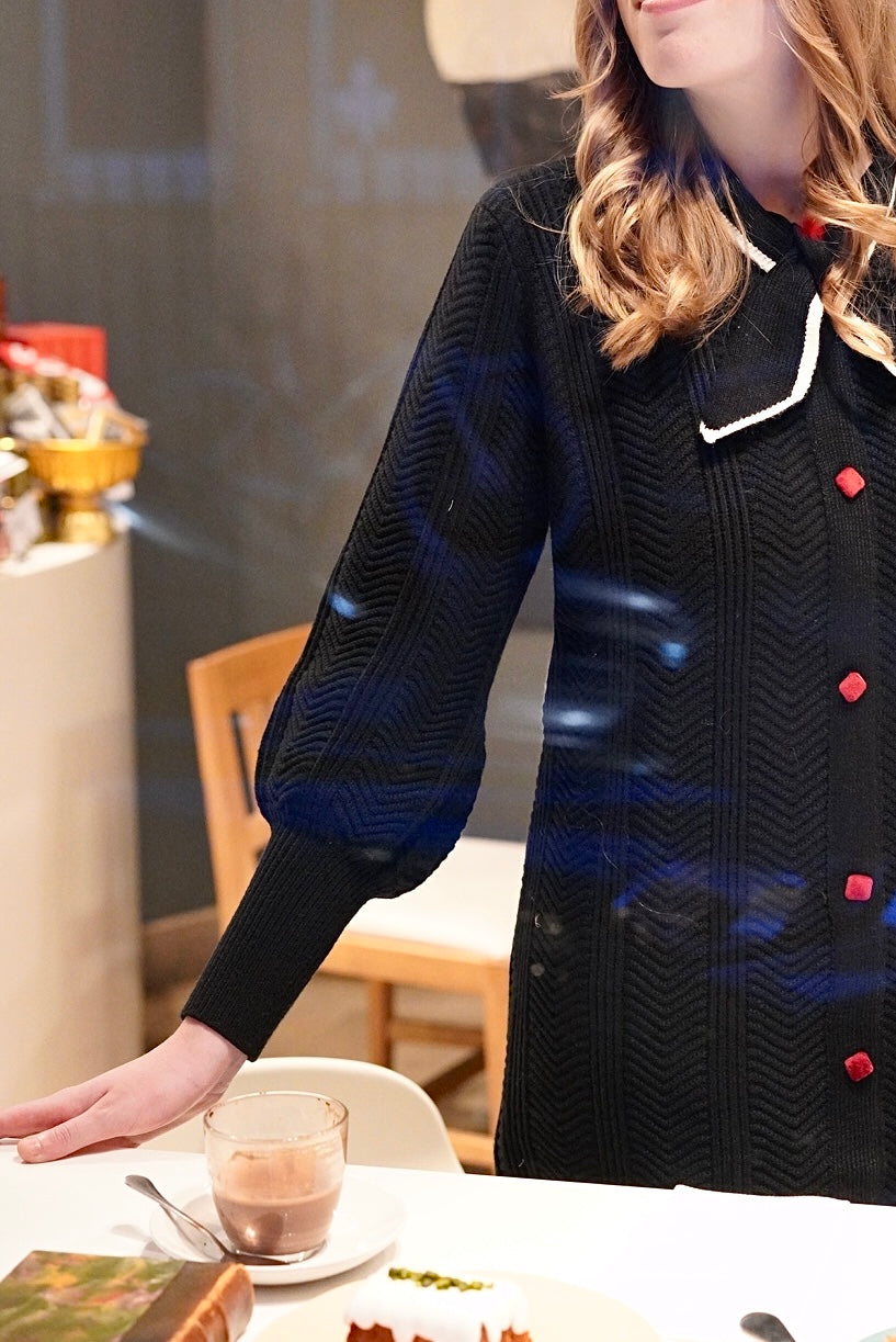 Embrace the retro and cosy look in our knitted O/S black dress inspired by the iconic Miss Marple. Features a cute tippet neck scarf and faux button-through on the front. This is a multi occasion dress that you can wear to go shopping, sight seeing or even slow walks in the park. Ask a loved one or your best friend to wear the Etoile Blouse and Fontaine Dress to coordinate your looks!