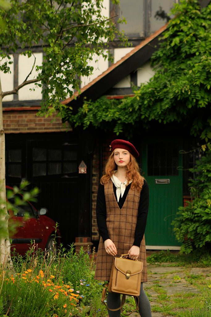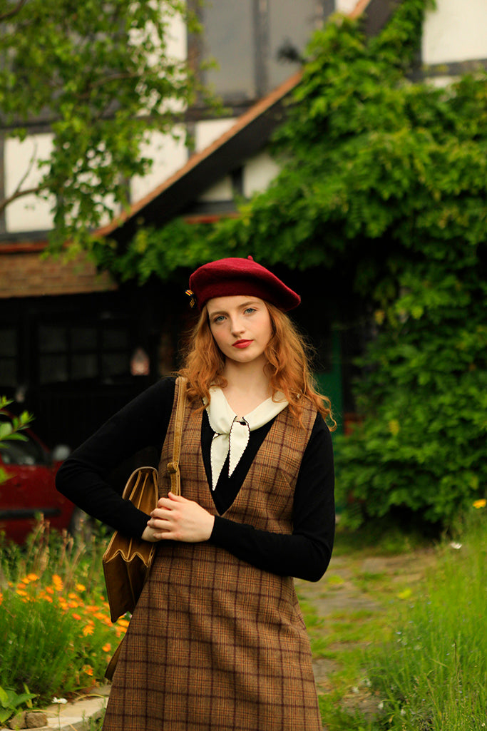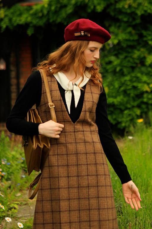 The earth’s rustic hue is fashioned in this flattering mini pinafore dress. Featuring a low cut V-neck shaped neckline and warm brown checked fabric. Enjoy the colder days and sip a hot cup of tea whilst you wear this dark academic pianfore made from a slightly woolen fabric. To best complete this outfit, wear with our Seize the Moment Shirt!