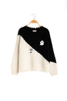 A cosy knit with a playful spooky twist. This limited-edition Halloween sweater features a bold black-and-white color block design, accented with a mischievous little ghost and a spider-web embroidery detail. Distressed edges add a vintage, lived-in charm, making it the perfect balance of cute and eerie.