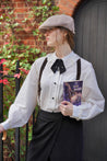 Creep into a world of dark mystery with the Raven Collar Shirt, a 100% cotton Wednesday-inspired piece that blends gothic charm with refined tailoring. Designed in an oversized silhouette for effortless comfort, it features a gentleman-style collar edged with delicate lace - structured yet romantic, and undeniably feminine. The detachable black bow at the neck gives you the freedom to shift your mood: wear it tied for a dramatic, Nevermore-ready look, or remove it for something cleaner and more austere. Billowing sleeves gathered at the wrist finish in lace-trimmed cuffs, adding a subtle softness to the bold, almost academic silhouette. This shirt feels both bookish and rebellious, perfect for dark academia outfits!