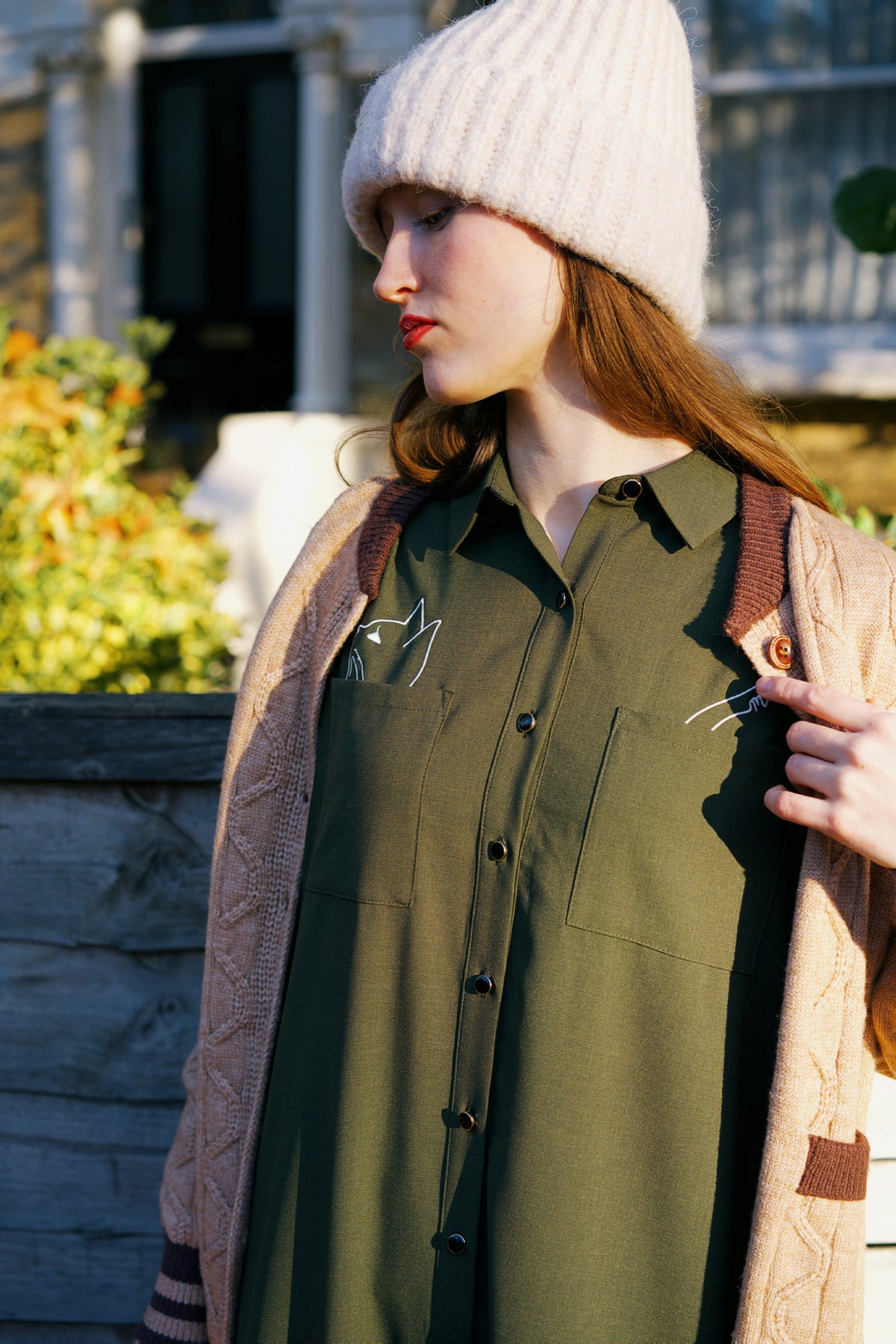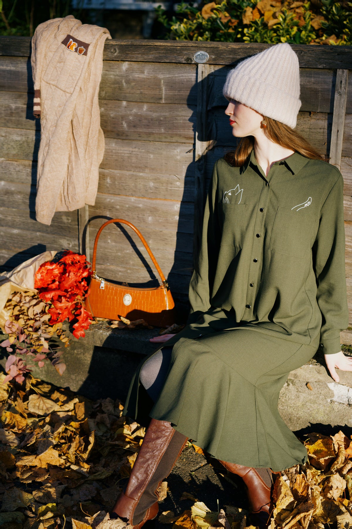 This season, be one of our Cool Cat Lady! Featuring original cat embroidery, complemented with frill hem, this midi-length shirt dress has a loose fit body shape, with a classic centre button-up fasten detail. Pair with our Feline Mintage Belt for a perfect transitional autumn look.