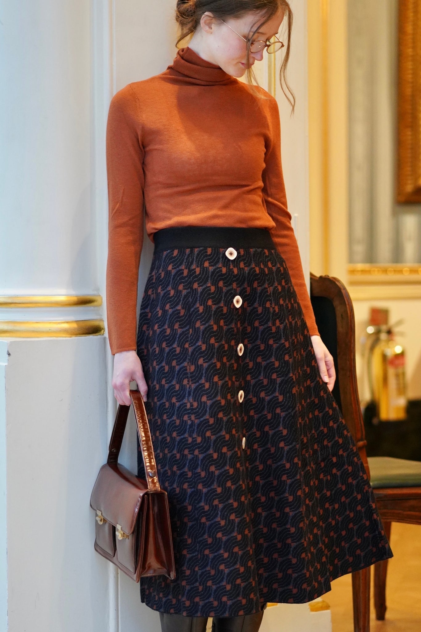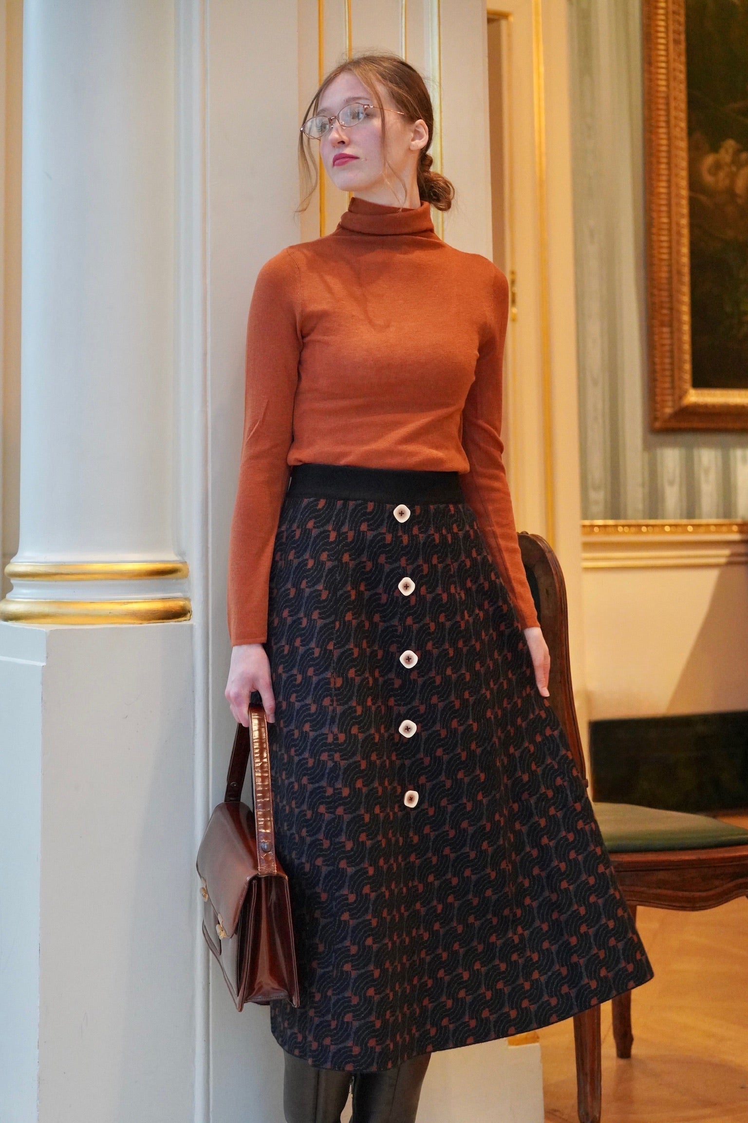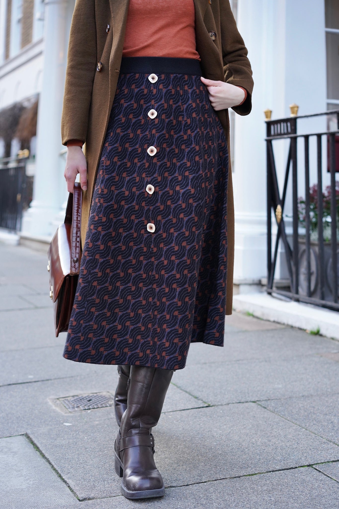 A cosy, heavyweight knit skirt in a 70s-inspired jacquard pattern - soft, warm and made for days with a chill. Designed with a flattering longline silhouette and a comfortable stretch waistband, it’s an easy throw-on piece that still feels polished. A classic design that pairs effortlessly with our jackets & coats - perfect for a smart, office-friendly academia look.