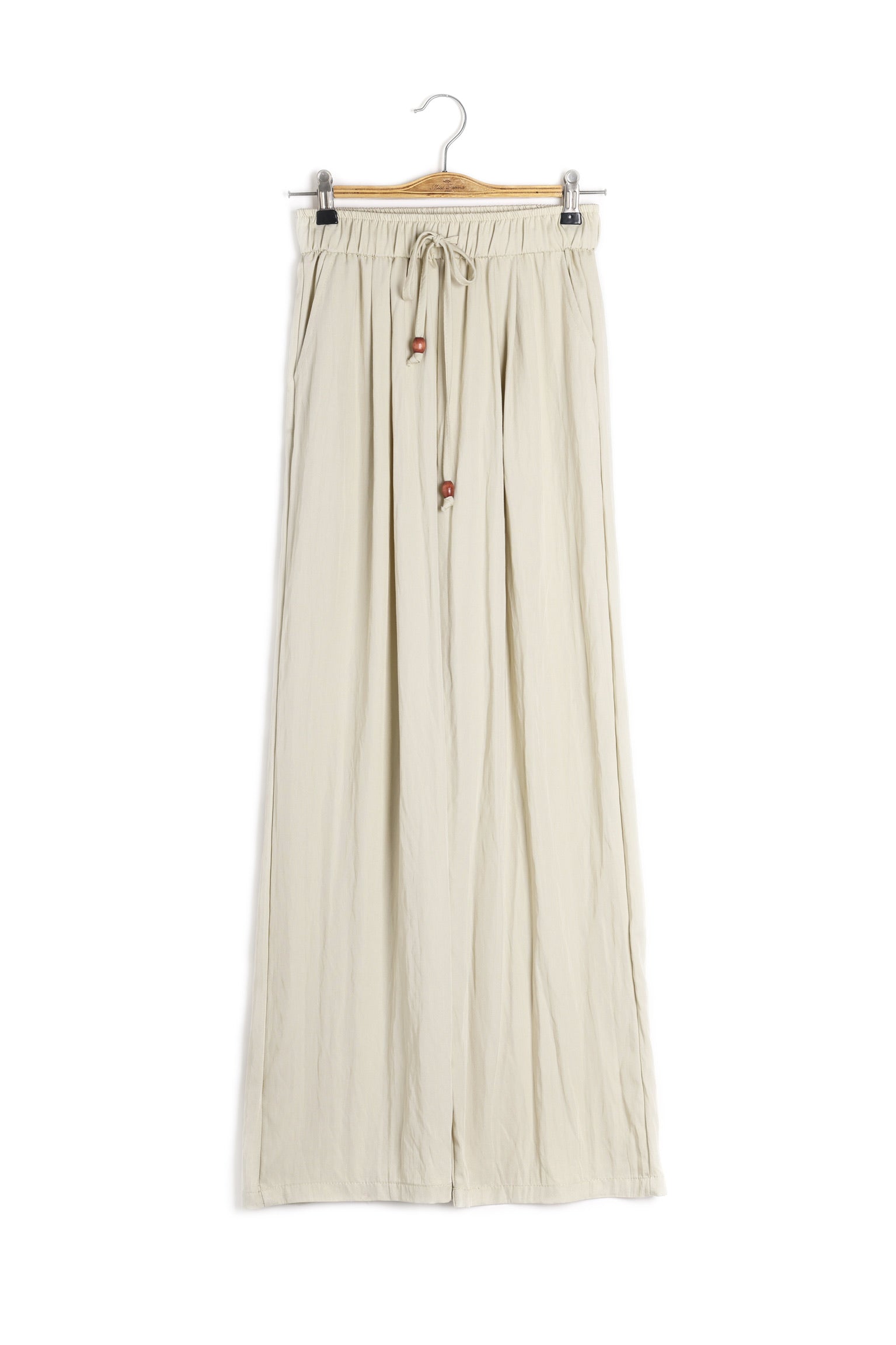 Designed with an elastic waist and finished with a drawstring featuring a charming wooden bead, they offer the perfect blend of comfort and style. Whether you’re lounging at home or heading out for a relaxed outing, these trousers pair beautifully with blouses, tanks, or oversized knits.