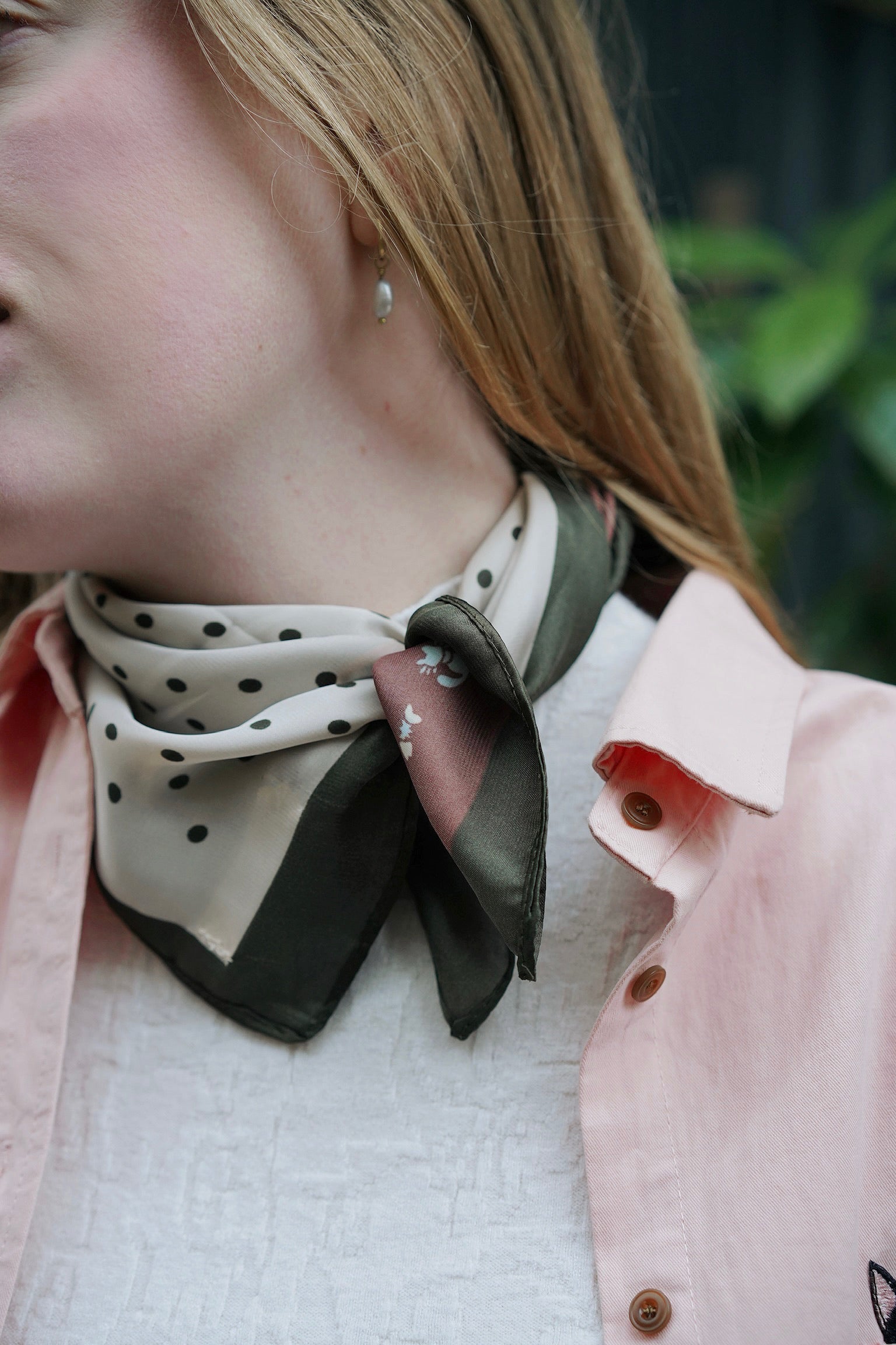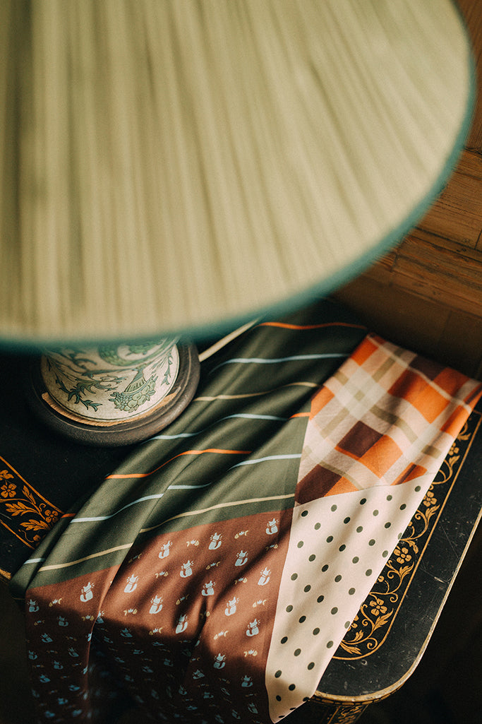 • Small square patchwork scarf with multi-coloured cat, check, stripe and dots print