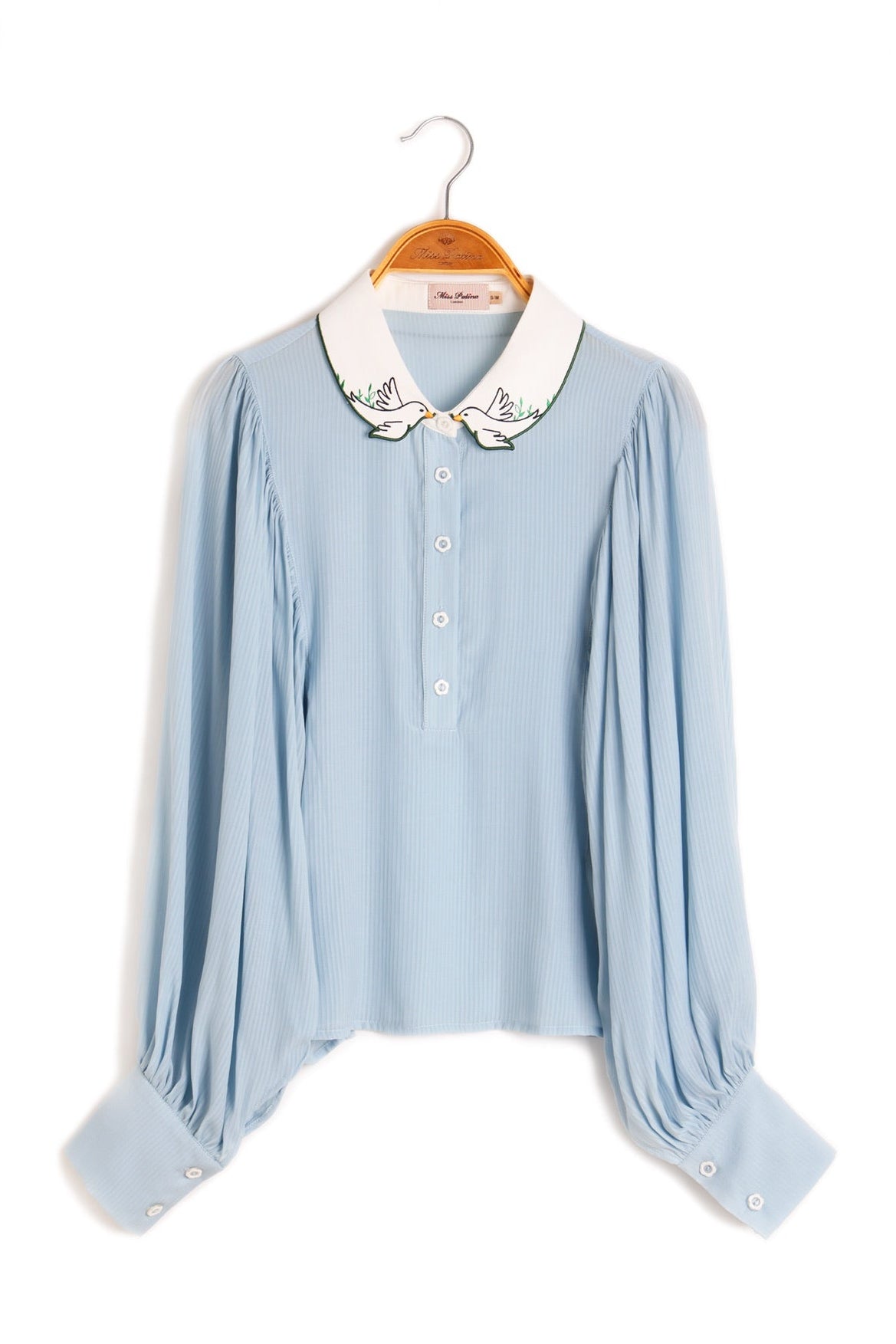 The collar features two tender songbirds facing one another, a nod to their devoted bond. Crafted from a beautifully soft, drapey fabric, it feels effortless on the skin, while the sculpted lantern sleeves and refined cut create a flattering, elongating silhouette.