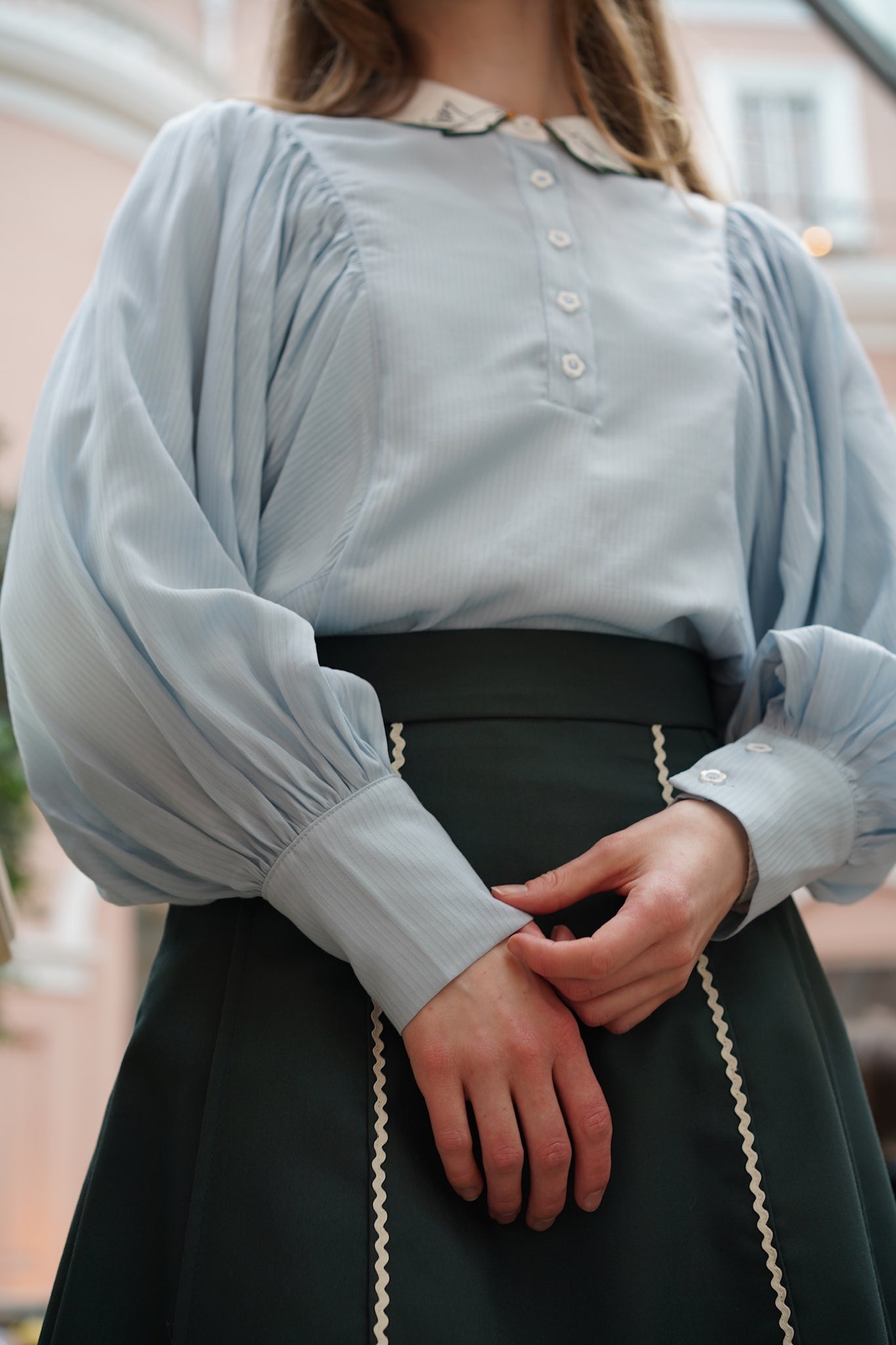 Our new powder blue version of the Lucky Songbird Blouse is inspired by our founder Holly’s talking budgie, Lucky, and his beloved wife Elizabeth, this new edition of our classic bird-collar blouse carries a quiet love story within its seams. Elizabeth has since passed away, and this piece is created as a gentle tribute to her warmth, companionship, and the little family they built together.