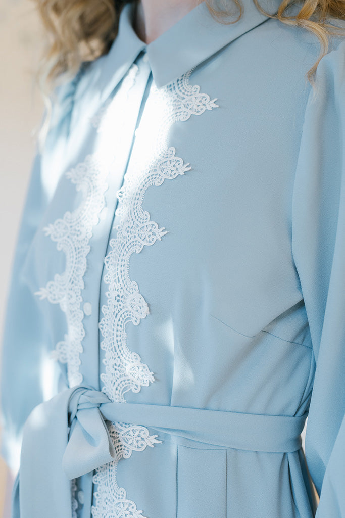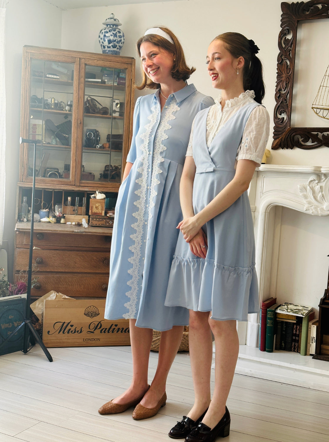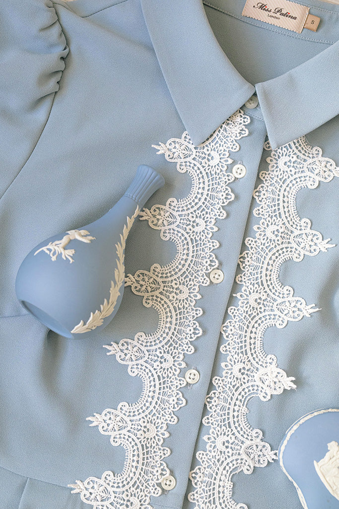 A Wedgwood inspired dress combining traditional craftsmanship with contemporary design. This dress features a romantic silhouette and impeccable tailoring with intricate lace embroidery and exquisite detailing. Loose swing shape for an airy fit in silky feel fabric, with detachable belt fastening. Pair with a fancy hat and retro heels!